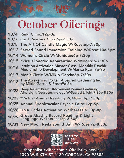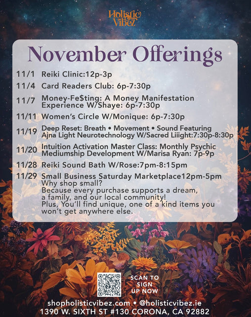 Welcome to our metaphysical oasis nestled in the heart of Corona, CA. At Holistic Vibez, we are more than just a women-owned business—we're a sanctuary dedicated to guiding our community on their profound journey towards spiritual awakening and holistic wellness. Explore our diverse array of healing modalities and receive a transformative experience tailored to nourish your mind, body, and soul.